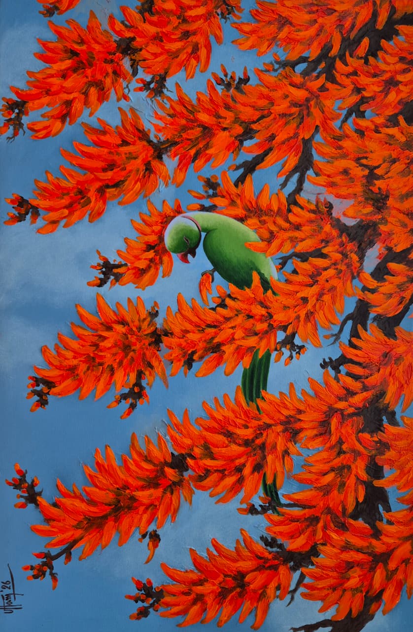 This artwork beautifully captures the harmony between vibrant flora and delicate wildlife. A serene green parakeet is nestled amidst a cascade of fiery orange blossoms, creating a striking visual contrast against the soft blue background. The composition draws the viewer into a quiet, intimate moment where nature feels both lively and peaceful.