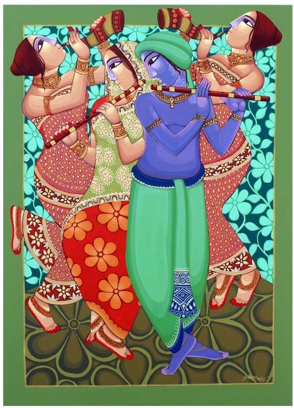 The artist employs a bold, folk-inspired aesthetic rooted in the traditions of Indian classical painting, blending it with a contemporary sensibility. Rich jewel tones — deep teals, warm reds, vibrant oranges, and lush greens — fill every inch of the canvas with rhythmic energy. The floral patterned background, reminiscent of textile motifs found in Rajasthani and Madhubani traditions, adds a decorative opulence that frames the divine narrative.