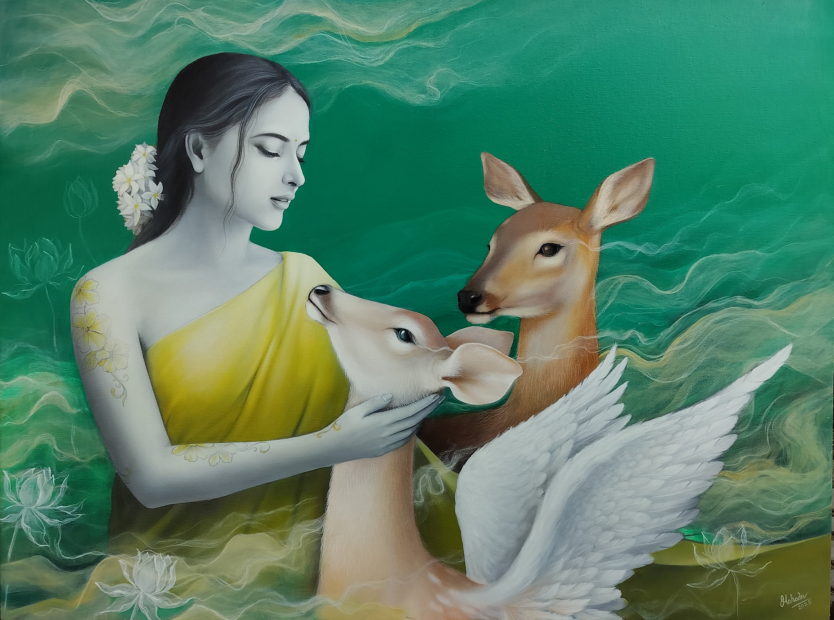 This is a painting from the *Prem Series*, in which a woman is gently caressing a deer. The deer’s wings represent the happiness hidden within love—something that is not seen, but felt. This painting depicts two worlds—one is **Realism**, which is visible to the eyes, and the other is **Surrealism**, which resides in the mind and emotions. The *black and white* wings of the woman and the deer signify that love is made up of all colors, just like sunlight.